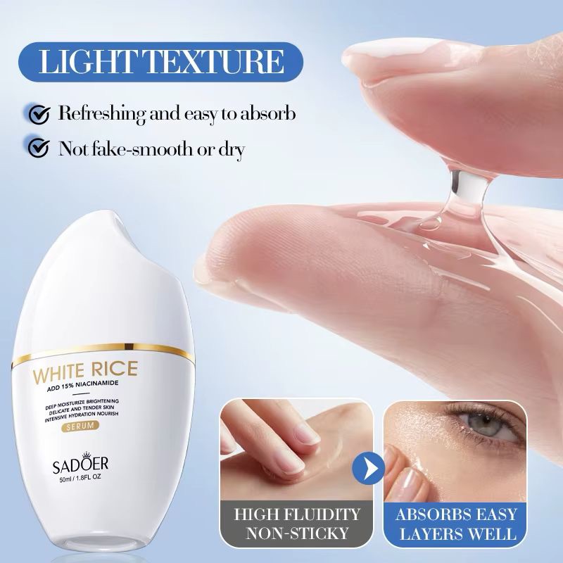 The lightweight, fast-absorbing formula penetrates deeply to nourish and revitalize skin, improving elasticity and texture. Regular use helps even out skin tone, restore softness, and reveal a luminous, healthy complexion. Suitable for all skin types, SADOER White Rice Serum is ideal for daily use, providing clear, smooth, and glowing skin.